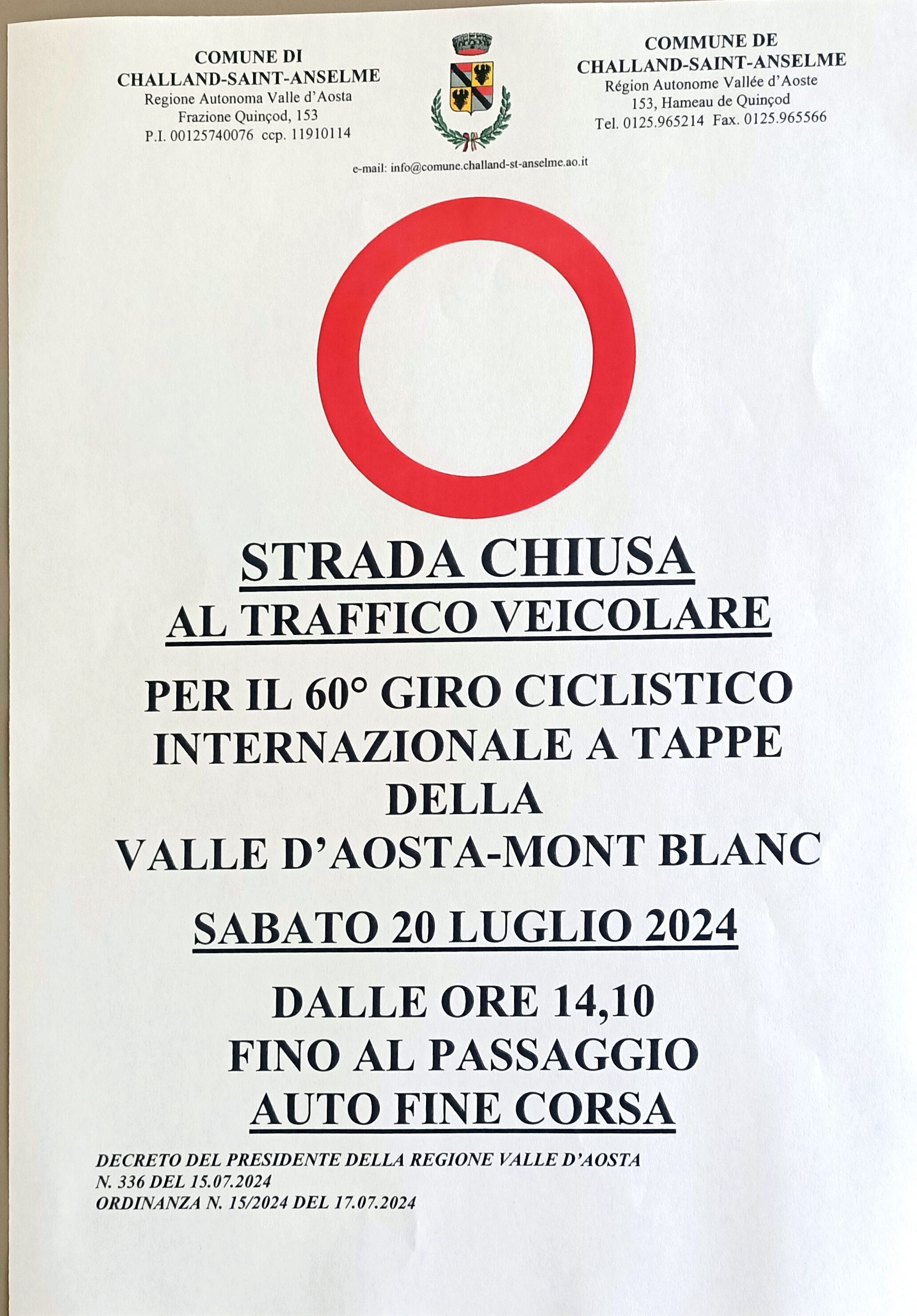 Sabato 20 luglio 2024 il Comune di Challand-Saint-Anselme sarà interessato dal passaggio della 4^ Tappa del 60° Giro ciclistico internazionale a tappe della Valle d'Aosta - Mont Blanc.