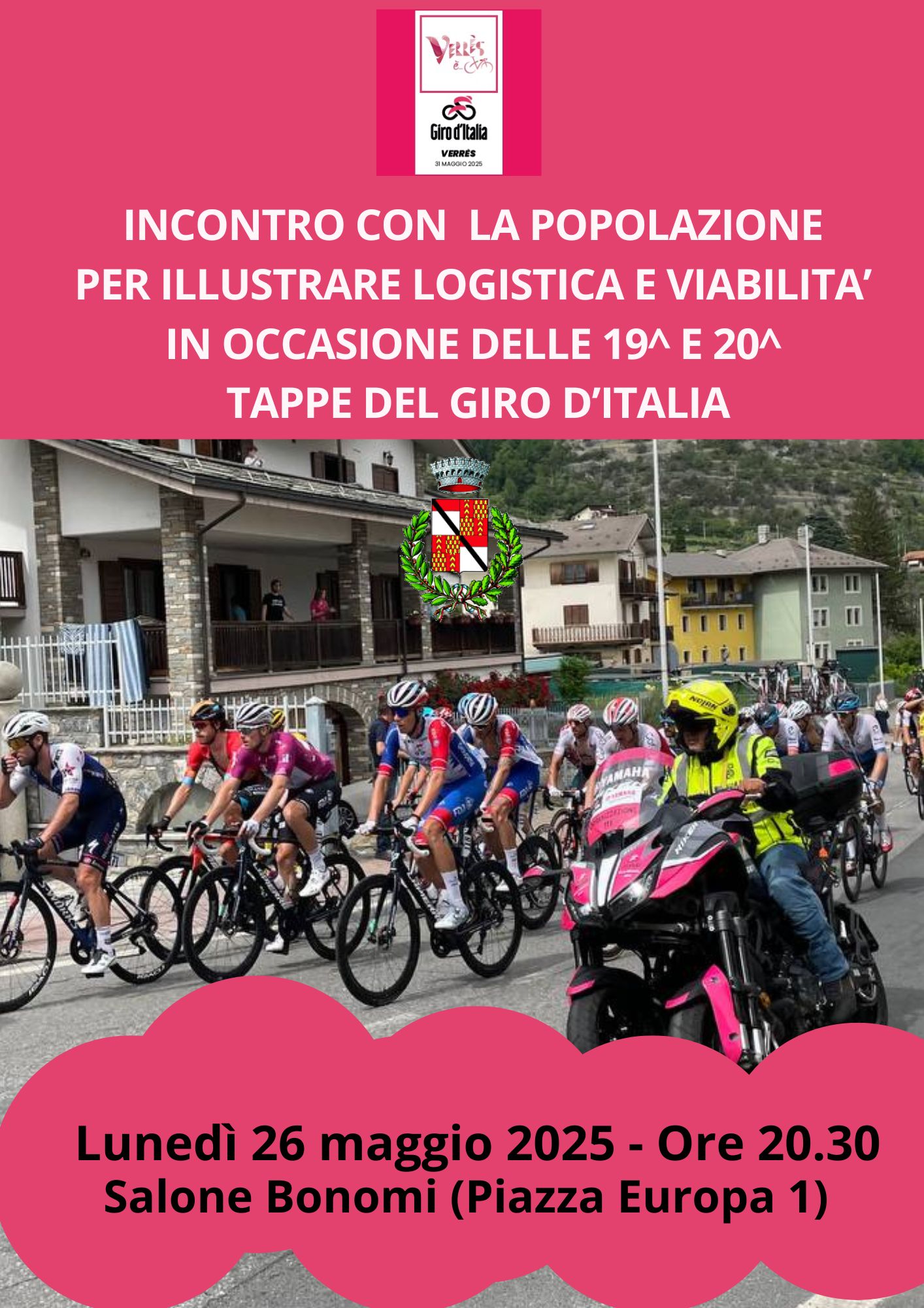 Lunedì 26 maggio 2025 - ore 20.30 Salone Bonomi (Piazza Europa 1) per illustrare logistica e viabilità in occasione delle 19^ e 20^ tappe del giro d'Italia