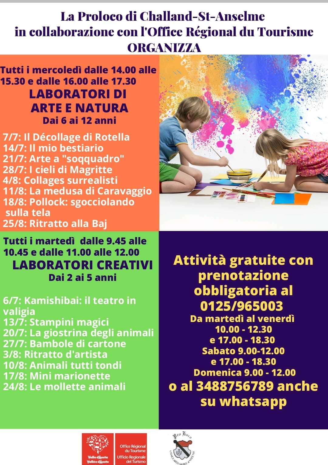 La Pro Loco in collaborazione con l'office Régional du Tourisme organizza laboratori di arte e natura e creativi per bambini dai 2 ai 12 anni.
