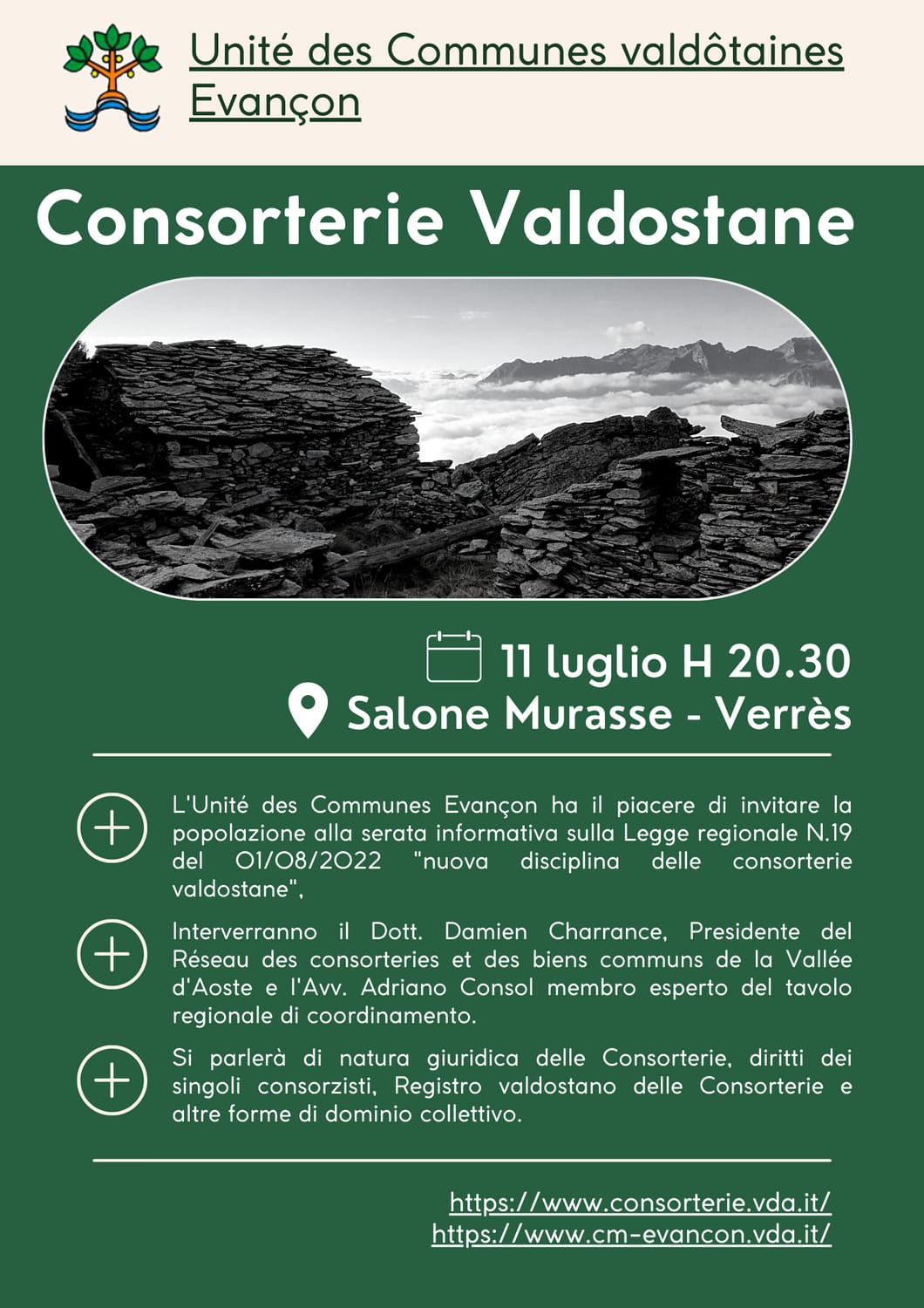 L'Unité des Communes Evançon ha il piacere di invitare la popolazione alla serata informativa sulla Legge Regionale n. 19 del 01/08/2022 "nuova disciplina delle consorterie valdostane".