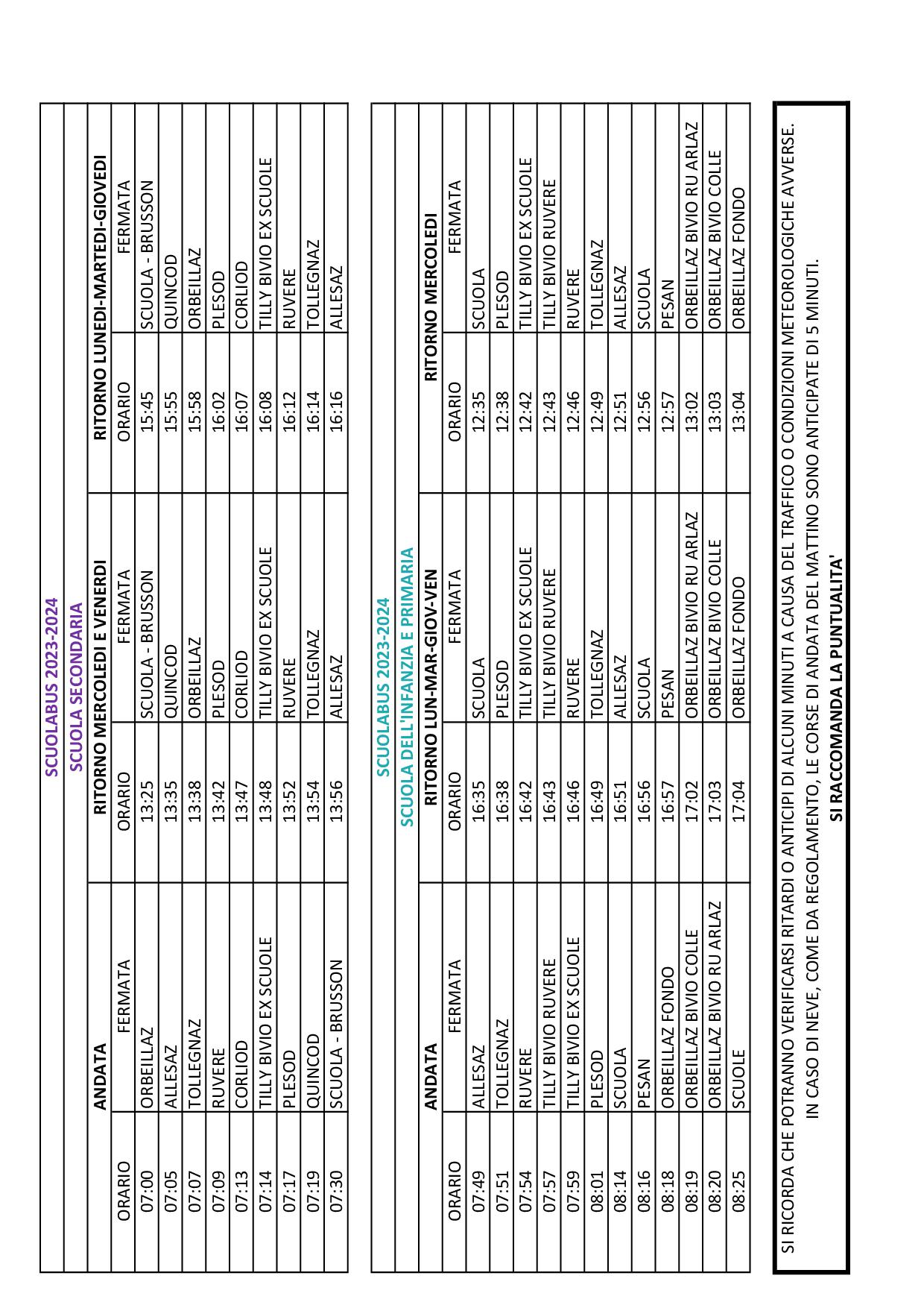 Si comunica che relativamente al primo giorno di scuola - 11/09/2023 - la corsa dell'andata verra' effettuata solo per la scuola secondaria e non per le scuole dell'infanzia e della primaria.