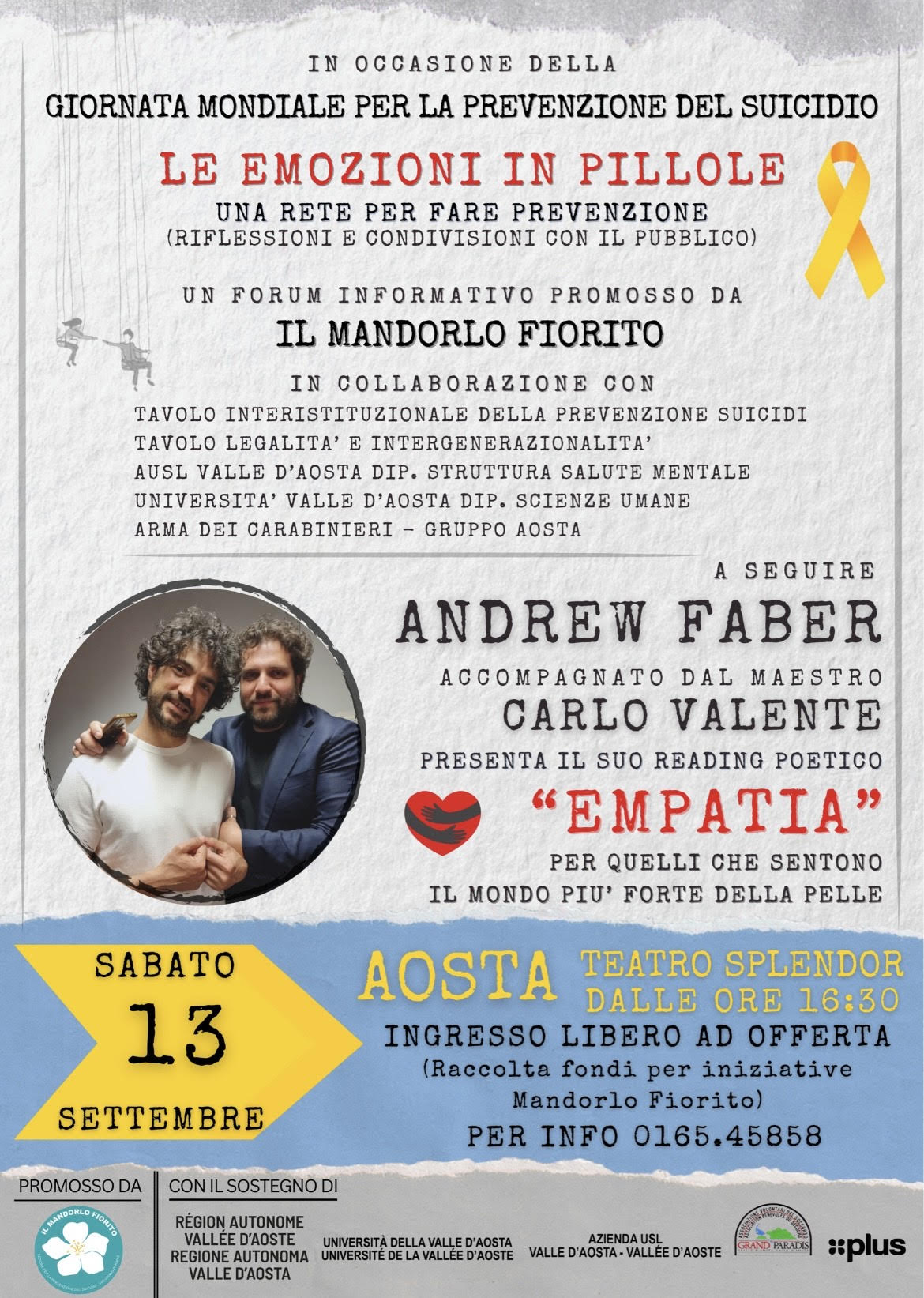 Sabato 13 settembre ad Aosta Teatro Splendor dalle ore 16:30 ( sedici e trenta)